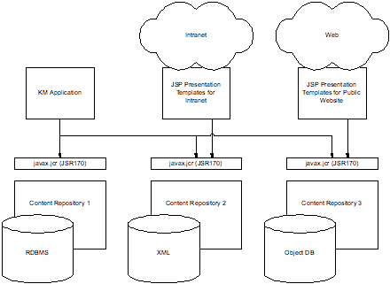The team implements the application using the Content Repository for Java Technology API to the content management (CM) systems. As the KM team finds more CM systems across the enterprise, the application can easily harvest the new data as well as that from the existing systems.