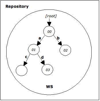 The small circles represent nodes. The arrows point from parent to child and are labeled with the name of the child. The name of the root node is actually the empty string though, for clarity, it is indicated here with the string “[root]”. The numbers within the nodes represent the UUIDs of the nodes. For example, the UUID of the root node / is 00 and the UUID of /a/d is 03. The node /a/c is not referenceable and therefore does not have a UUID.