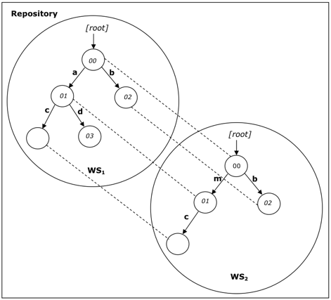 Note there can also be nodes (such as /a/d in WS1) that exist in one workspace but not in the other.