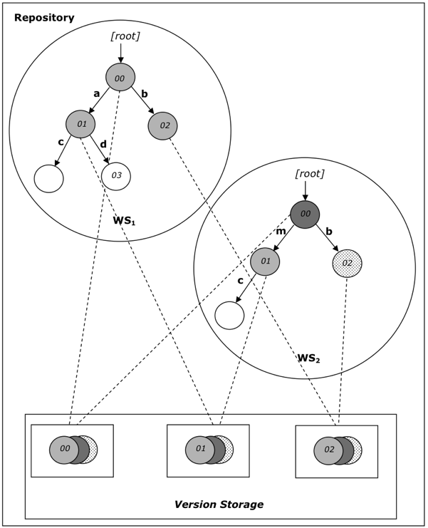 At any given time a particular workspace may hold nodes based on various versions stored in version storage. In the diagram, WS1 holds nodes based on the “light gray” version of the nodes 00, 01 and 02. WS2, in contrast, has nodes based on the “dark gray” version of 00, the “light gray” version of 01 and the “dotted” version of 02.