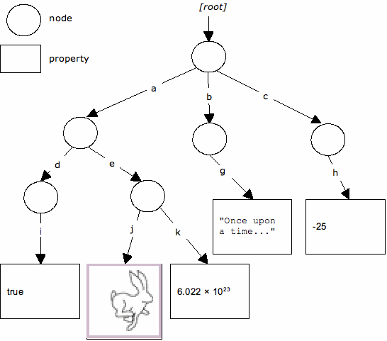 In the diagram above, we see the single root node of some workspace with child nodes a, b and c, each of which have further child nodes or properties. For example, the node a has two child nodes, d and e. Node e, in turn, has two properties, j and k. The property j contains an image (a picture of a rabbit) and k contains a floating-point number (6.022 × 1023). Similarly, the property i contains a boolean value (true), the property g contains a string (“Once upon a time...”) and the property h contains an integer (-25).