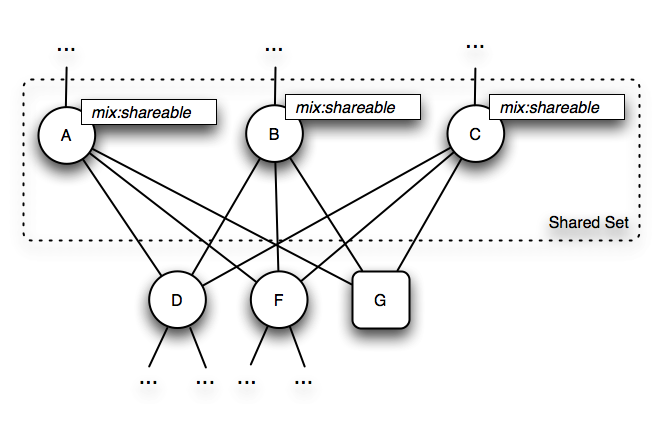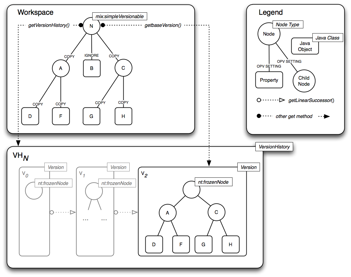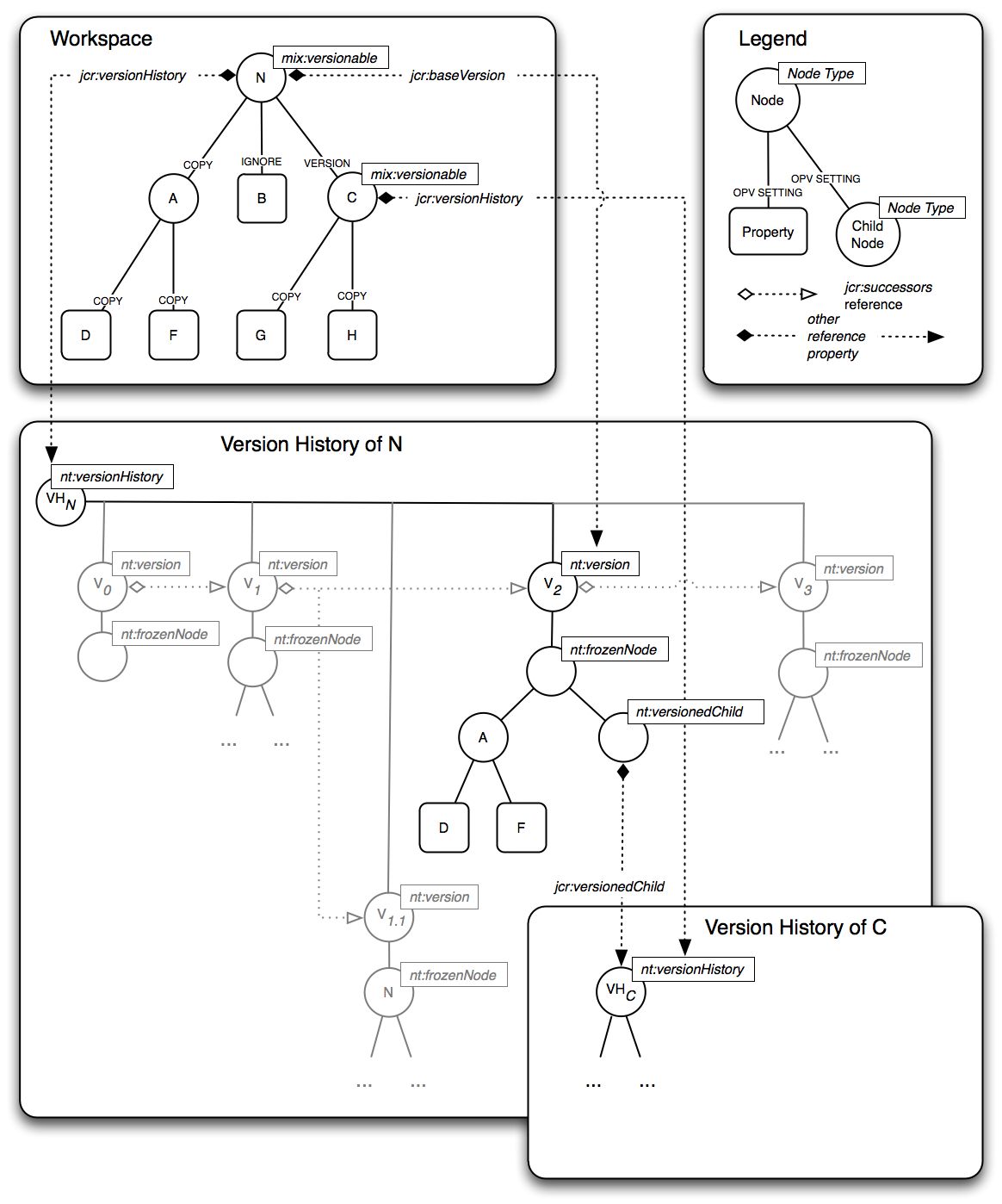 The relation of corresponding versionable nodes to the same version history reflects these semantics in that when different copies of the same content entity are changed and checked-in from different workspaces the resulting versions are all recorded within the same version graph and, depending on their individual base versions, extending that graph at different points.