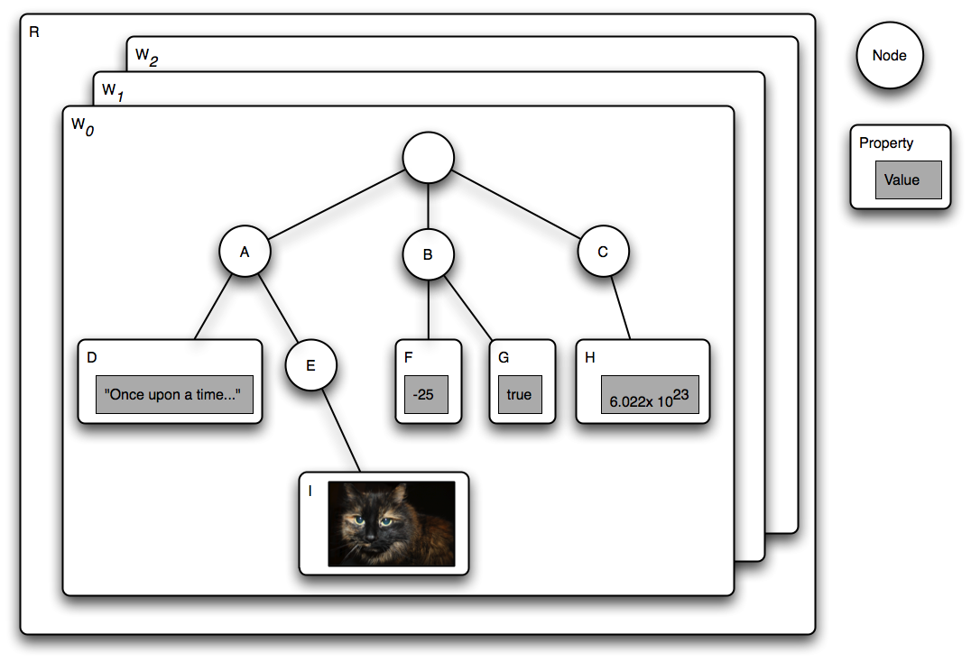 The nodes of a workspace form the structure of the stored data while the actual content is stored in the values of the properties.