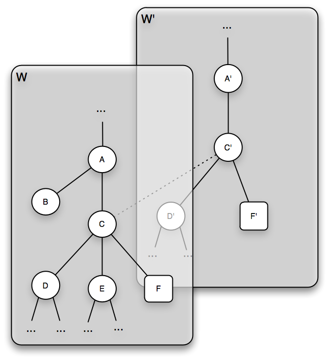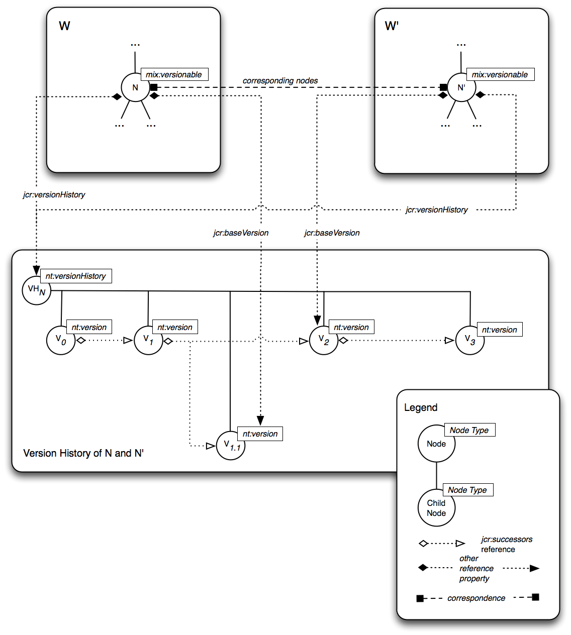 The above diagram depicts two workspaces, W and W' containing corresponding nodes N and N', both versionable. Because the two versionable nodes correspond, they share the same version history, as shown by their respective jcr:versionHistory references both pointing to the same nt:versionHistory node. Despite sharing the same history, at any given time, corresponding nodes may have distinct base versions within that history. In this diagram the base version of N is V1.1 while the base version of N' is V2.